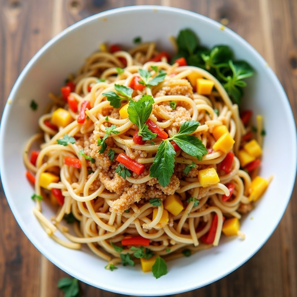 Este pad thai es una opción equilibrada, rica en proteínas y con una buena cantidad de vitaminas y minerales provenientes de las frutas tropicales. La elección de los vegetales frescos y el tofu lo hace bajo en grasas, ideal para mantener una dieta saludable. Si tienes restricciones dietéticas, puedes ajustar la cantidad de aceite o utilizar aceite de coco, y considerar opciones sin gluten si es necesario.