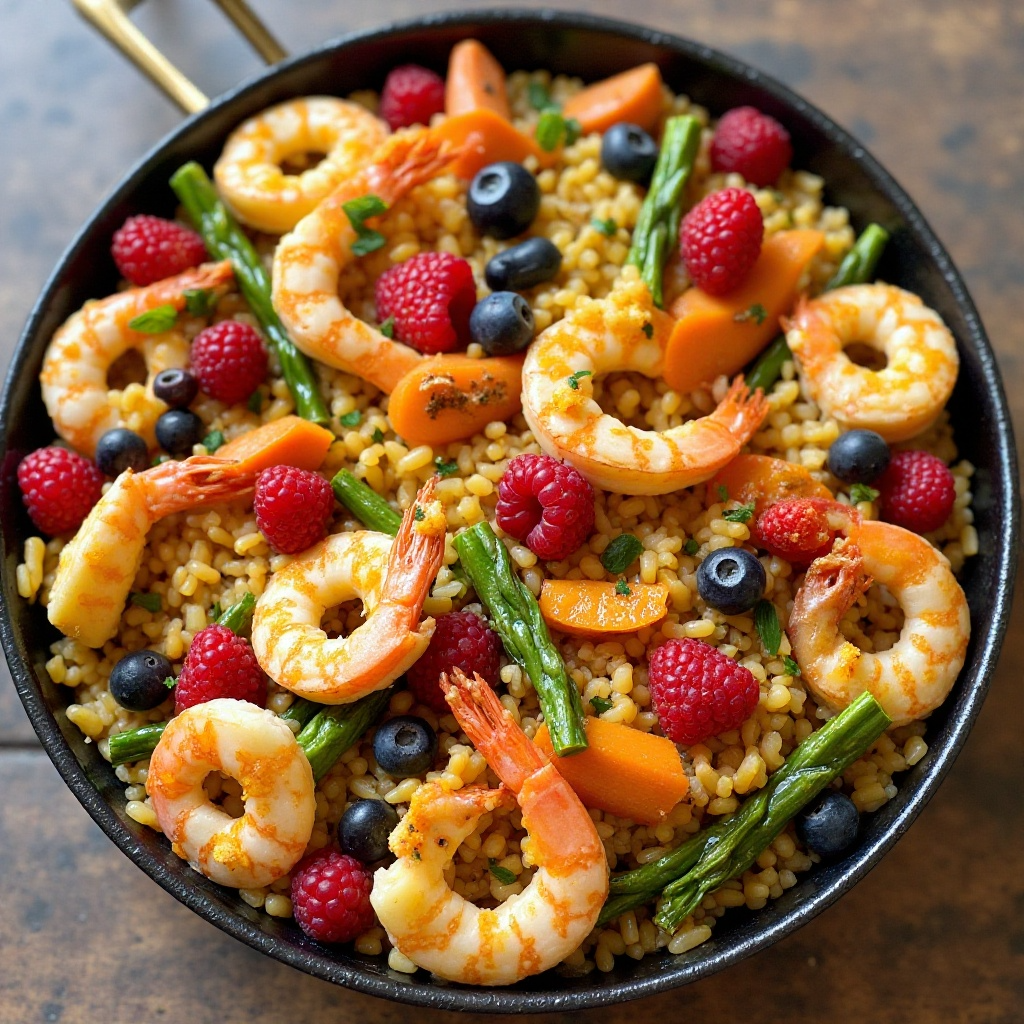 - Justo antes de servir, esparce la fruta de la Tierra de Frigiliana sobre la paella para añadir un toque dulce y fresco a cada bocado. Sirve inmediatamente.