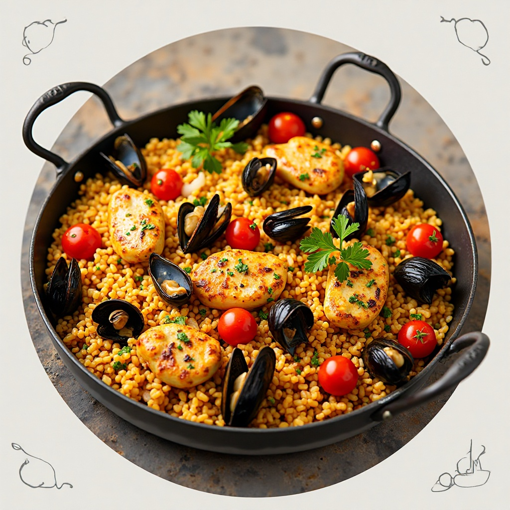 La paella es un plato tradicional español que se ha popularizado por su rica variedad de sabores y texturas. Esta versión especial utiliza vino de Bullas para Caravaca de la Cruz, una región vinícola española conocida por sus caldos robustos y complejos, aportando un sabor distintivo a esta receta.