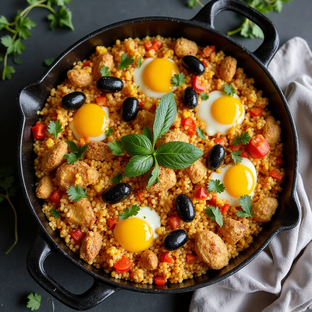 - Sirve la paella caliente, decorada con pimientos, aceitunas, y los aromáticos (cilantro y perejil) al gusto. Añade cubiertas adicionales si están disponibles, como mejillones o calamar.