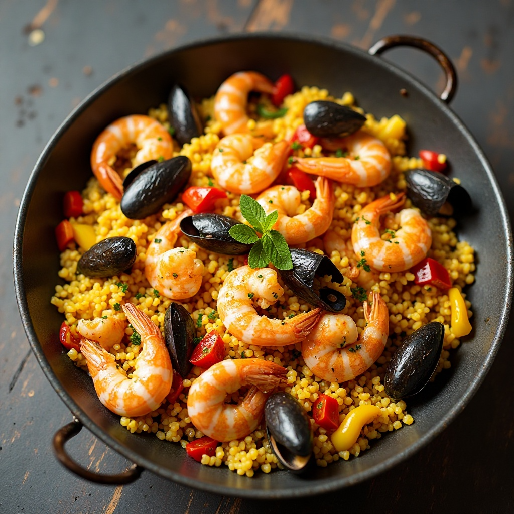 7. Sirve la paella caliente en platos grandes, disfrutando de su textura única y sabores mediterráneos.