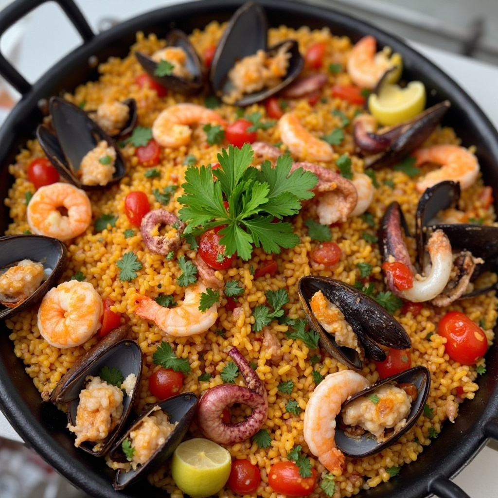 La paella, originaria de la costa sur de España, es un plato versátil y lleno de sabores. En Sag Harbor, Nueva York, una comunidad con fuertes raíces culturales hispanas y costumbres marineras, se adapta con ingredientes locales y frescos, como mariscos, para crear una versión única. Este plato es perfecto como plato principal en comidas informales o celebraciones.