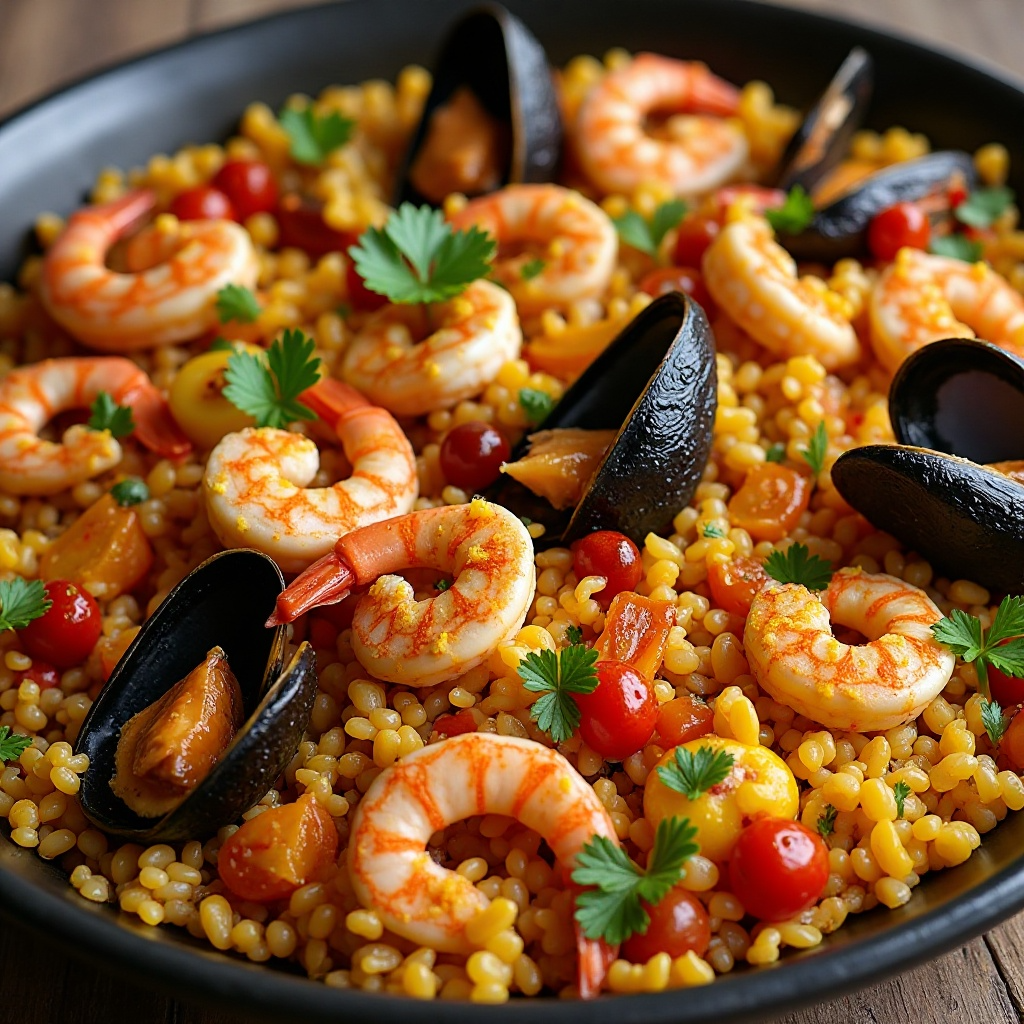 La paella es un plato tradicional español originario de la región de Valencia, pero ha sido adaptado por cocineros en toda España para incluir una amplia variedad de ingredientes. En Cala-Bassa, una hermosa y pintoresca ciudad de Mallorca, las playas y el mar influencian directamente la cocina local. La Paella de Mariscos Cala-Bassa es una versión vibrante y costera que destaca por sus ingredientes frescos del mar y la explosión de sabores mediterráneos.