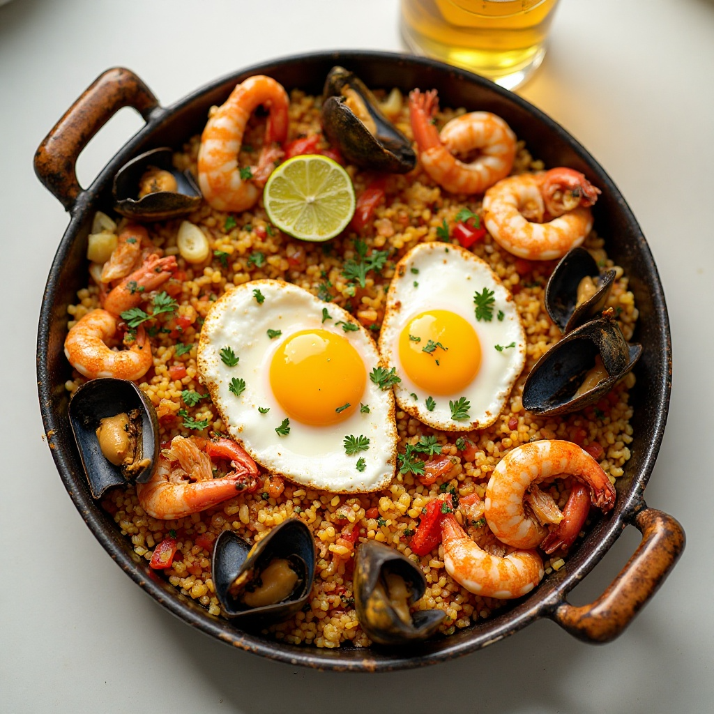 - Sirve la paella caliente, adornada con huevos fritos por encima para una capa de huevo enriquecida, según prefieras.