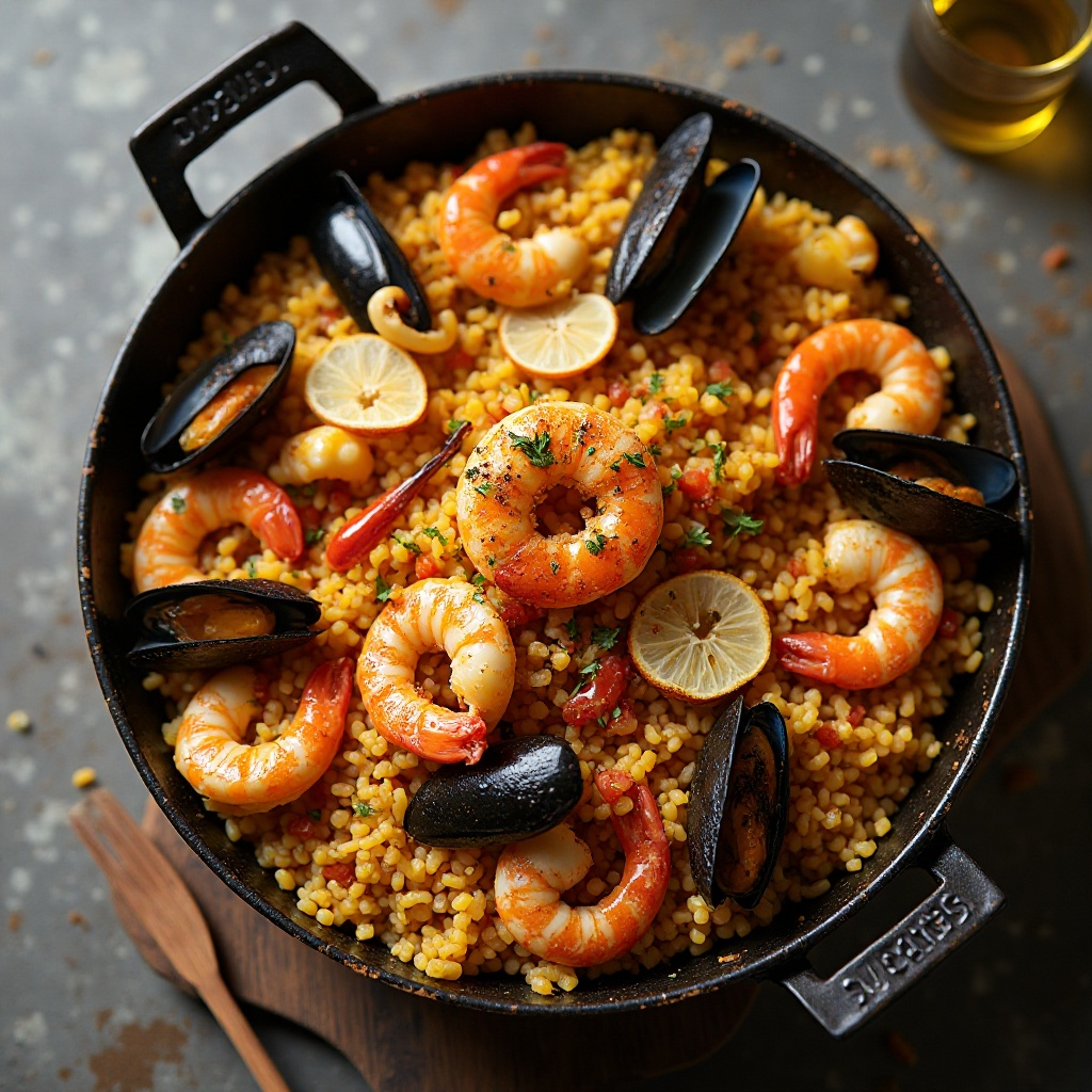 La paella es un plato tradicional de la cocina valenciana y esta versión incorpora elementos típicos de la región de Port-de-la-Selva en Catalunya, España. Aquí se integra el sabor del vino tinto local, que aporta una complejidad única a este arroz marisquero, creando un platillo ideal para disfrutar de la rica fusión gastronómica de la zona.