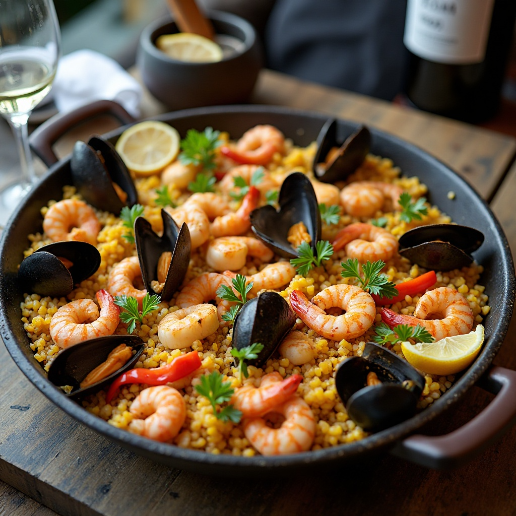 La paella de mariscos es rica en proteínas y ácidos grasos omega-3 debido a los mariscos. Los mejillones y las vieiras son particularmente beneficiosos para la salud cardiovascular. El arroz sin gluten (si se elige) puede adaptarse a una dieta más restrictiva. Recuerda consumir moderadamente para evitar el exceso de calorías.
