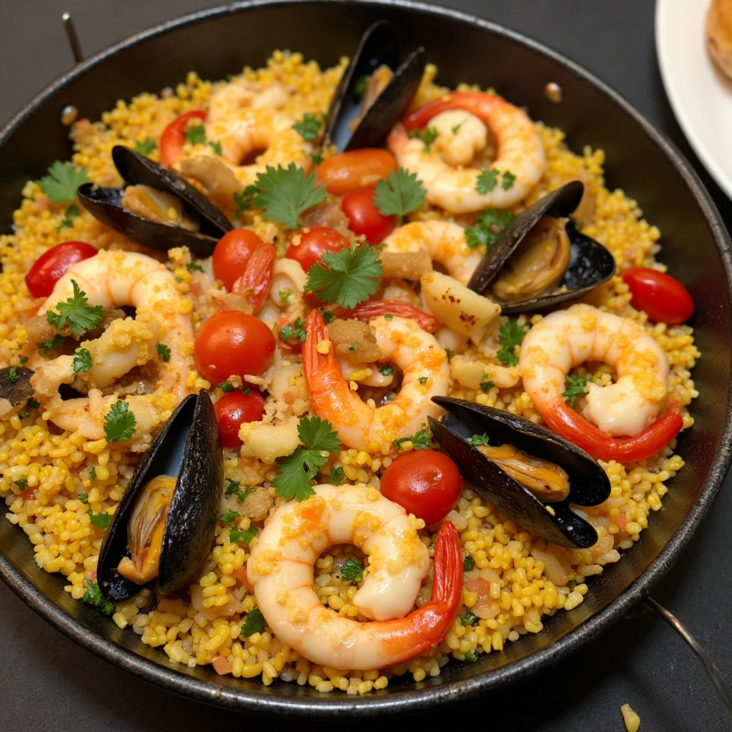 Este plato es rico en proteínas de mar y fibra gracias al arroz. La presencia de mejillones, camarones y calamares proporciona omega-3, beneficiosos para el corazón. Asegúrate de que los mejillones estén abiertos y firmes antes de usarlos, y que todos los mariscos estén bien cocidos para la seguridad alimentaria.