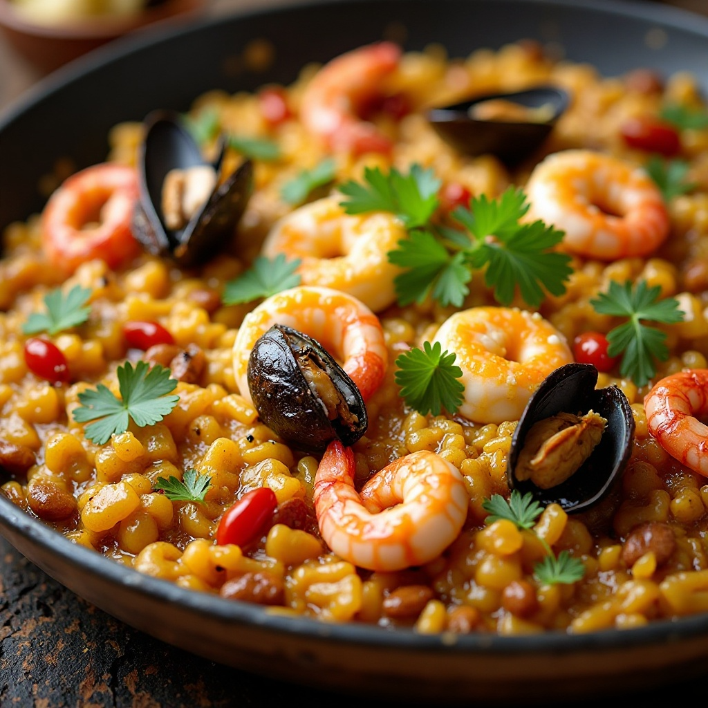 La paella se originó en la región de Valencia, España, y ha evolucionado con ingredientes locales en diferentes partes del país. La inclusión del Quesadas Pasiegas es un homenaje a los sabores regionales del norte, donde este queso se produce. Es un plato que no solo es un festín para los sentidos sino también una celebración de la diversidad culinaria española.