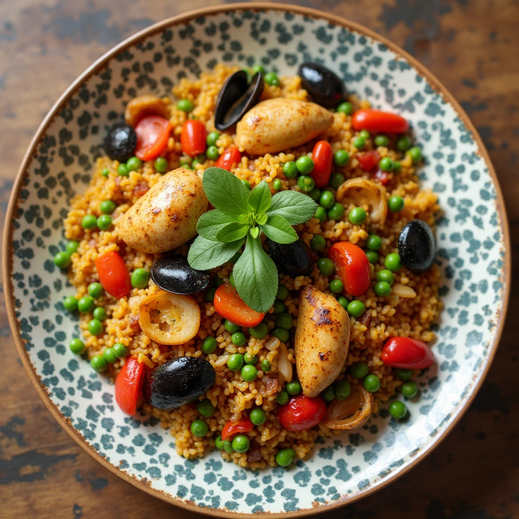 Este plato ofrece una buena fuente de proteínas con el pollo y mejillones. Los vegetales aportan fibra y antioxidantes. Evita sobrepasar el punto de cocción del pollo para asegurar su seguridad alimentaria y considera las opciones de mariscos frescos para un toque de omega-3.