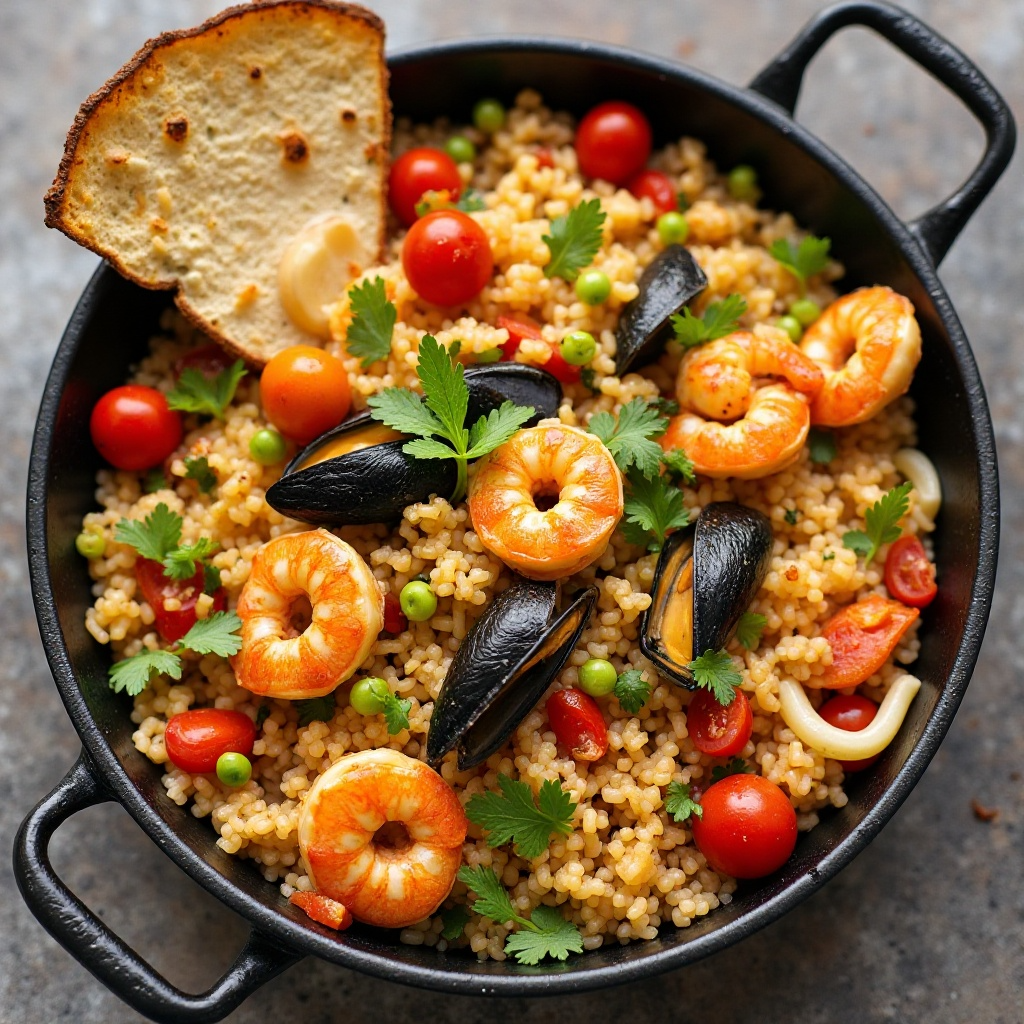 - Agrega las gambas, el calamar y el resto de mejillones a la paellera. Cocina todo hasta que las gambas estén rosadas y los mejillones abiertos, aproximadamente 5-7 minutos.
