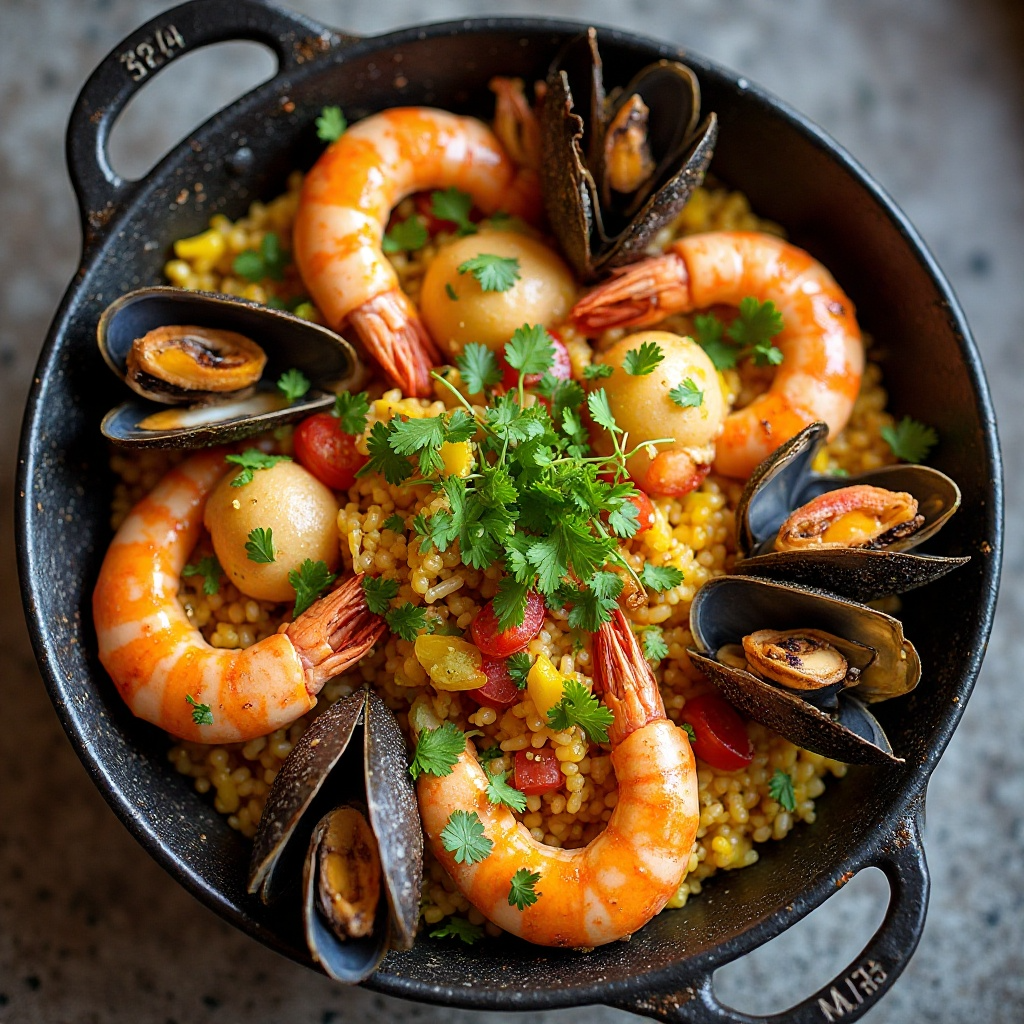 La paella es un plato emblemático de Valencia, España, que tradicionalmente se prepara en una paellera, una sartén de fondo bajo y grueso. Esta versión especial incluye un envejecido del vino de la Tierra de Orce, dando un toque único a este clásico arroz con mariscos y verduras.