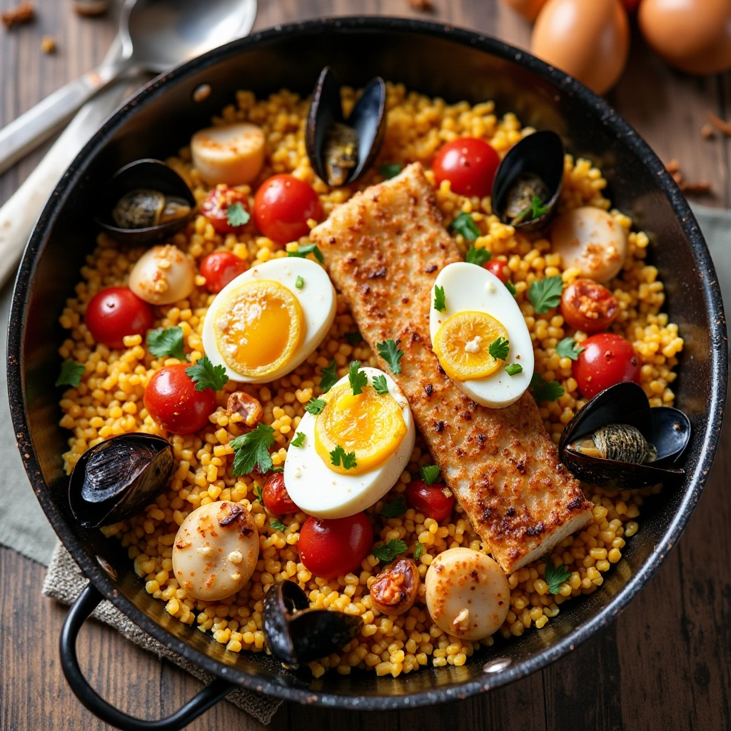 Esta paella es baja en grasas y rica en fibra gracias al arroz y verduras. El uso de mejillones y boquerones aporta proteínas saludables. Asegúrate de cocinar los ingredientes adecuadamente para reducir cualquier riesgo de contaminación cruzada y consumir el bacalao desalado previamente para evitar posibles problemas gastrointestinales.