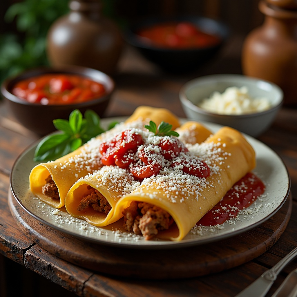 - Coloca una palacsinta sobre una porción de la carne con tomate en el plato, repite con las demás, decorando con queso rallado si lo deseas.