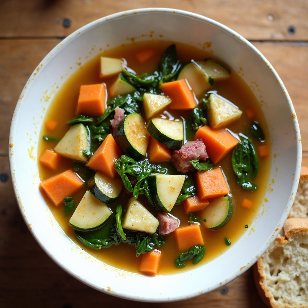 - Retira del fuego, agrega sal y pimienta al gusto. Sirve el caldo con las verduras y jamón serrano caliente, acompañado de pan tostado si se desea.