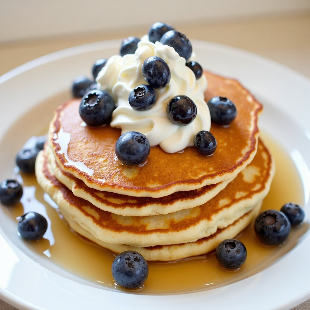 Este plato es una fuente de energía gracias a los carbohidratos presentes en los pancakes y el maple syrup, que proporciona azúcares naturales. La adición de arándanos secos introduce antioxidantes al desayuno. Recuerda disfrutar en moderación, especialmente del maple syrup debido a su contenido de calorías.
