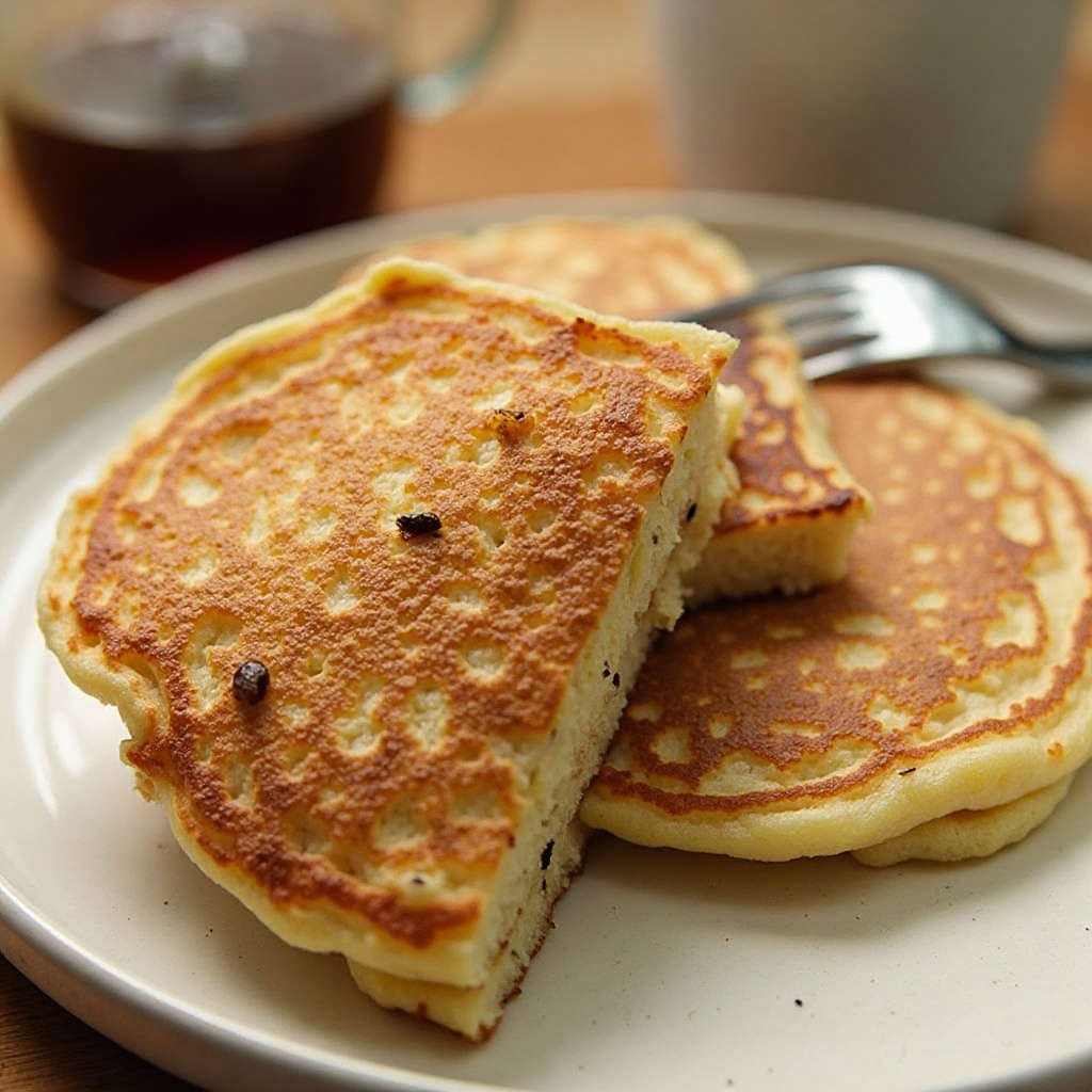 - Llena una sartén antiadherente con un poco de aceite y cocina los pancakes a fuego medio-bajo. Forma discos de aproximadamente 1/4 de taza cada uno y cocina hasta que estén dorados, unos 2 minutos por lado.