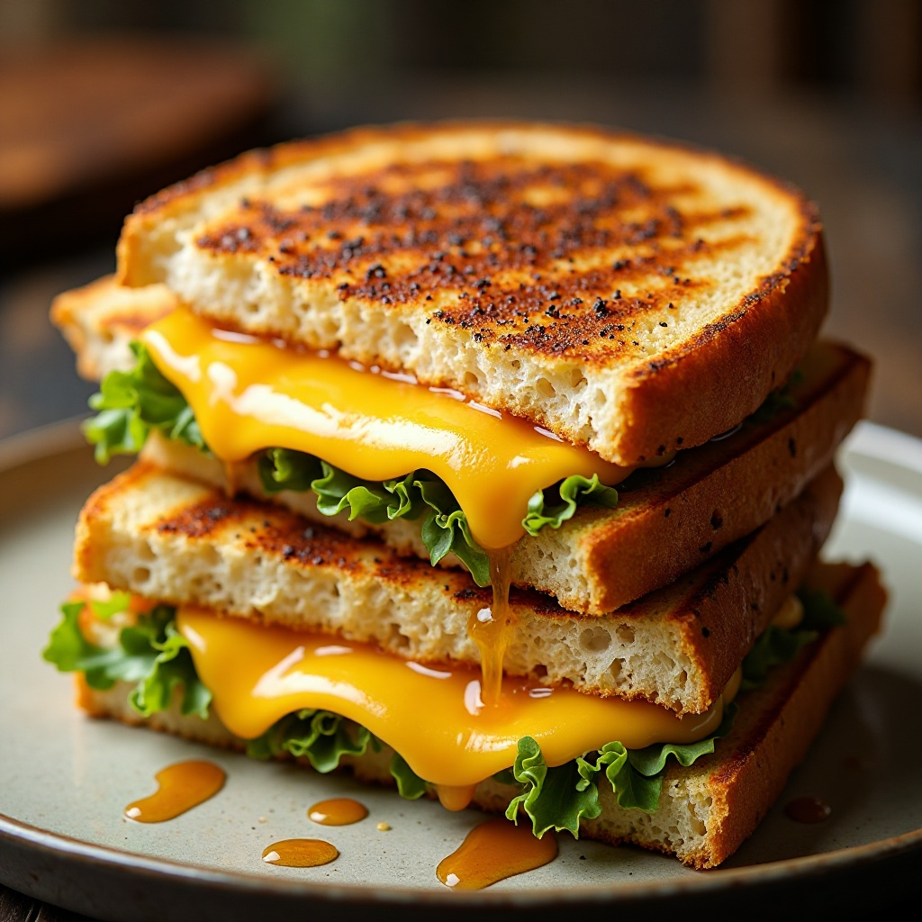 - En cada rebanada de pan, coloca una porción generosa de queso gruyere y cheddar, dejando espacio para la lechuga. Añade una cucharada del sirope de maple.