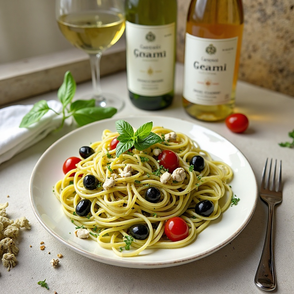 7. Sirve los espaguetis al pesto en platos, decorando con aceitunas negras, cherrys y una copa de vino blanco de los Castelli Romani para cada uno.
