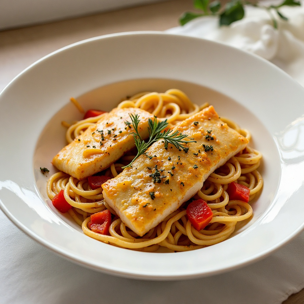 4. Una vez cocida la pasta, escúrrela y resérvala. Vierte parte del agua de cocción reservada en la sartén con los filetes y verduras, suficiente para crear una salsa ligera. Cocina a fuego bajo por unos minutos para que los sabores se mezclen.