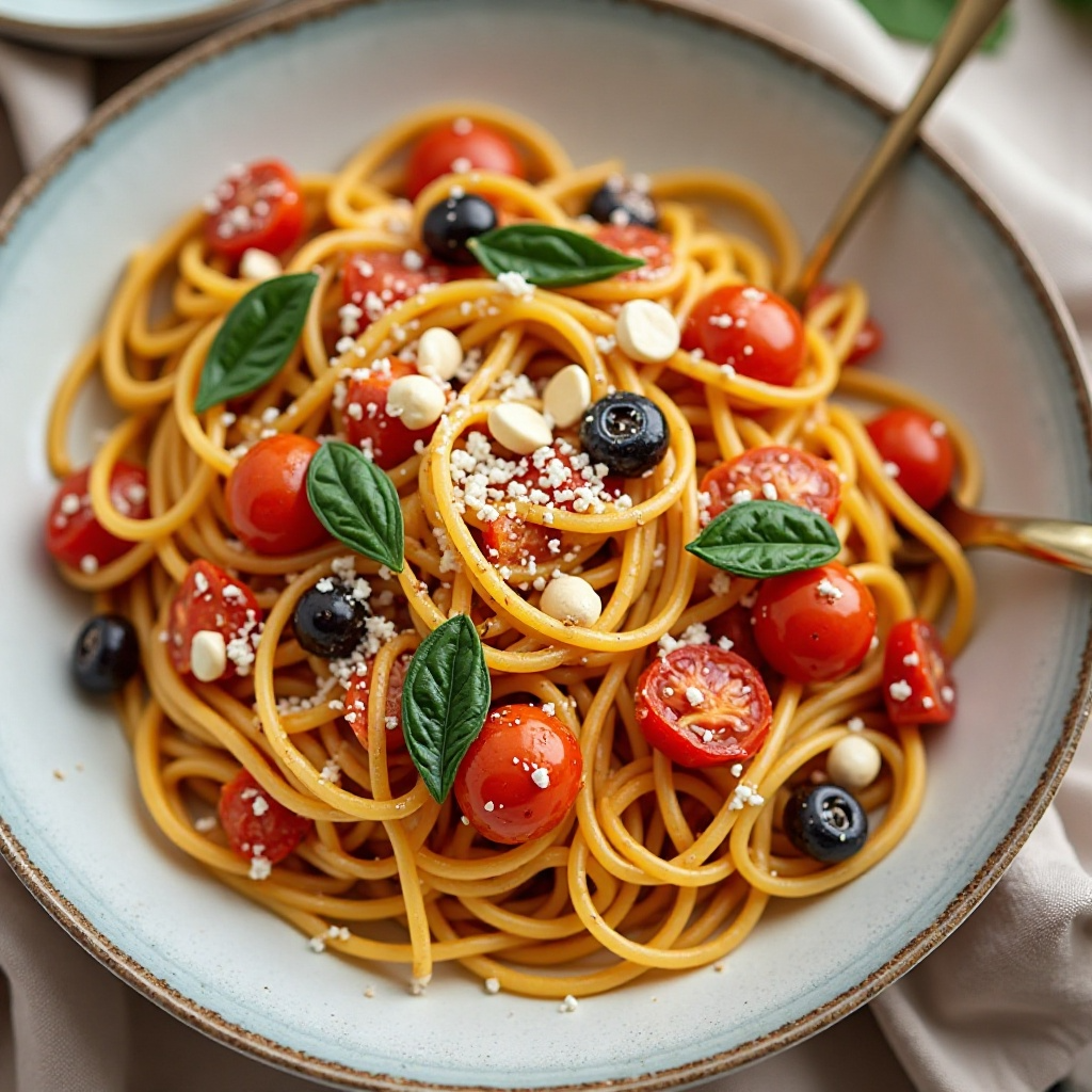Este plato es rico en nutrientes gracias a sus ingredientes frescos. La albahaca y los tomates proporcionan antioxidantes, mientras que las aceitunas y el aceite de oliva contribuyen a la salud cardiovascular. Asegúrate de usar aceite de oliva virgen extra para obtener los beneficios nutricionales completos.