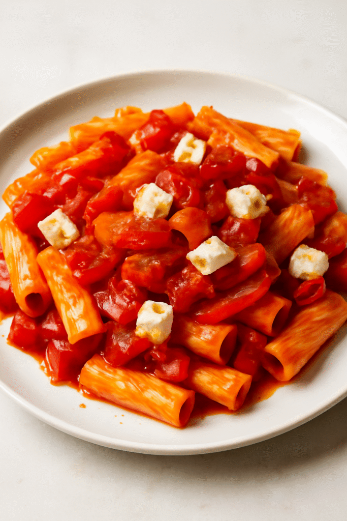 Este plato ofrece una buena fuente de fibra gracias al tomate y al pimiento rojo, y proteínas del rigatoni. La ricotta salata es baja en grasa y puede ser un excelente reemplazo para aquellos que buscan opciones más ligeras. Recuerda ajustar la sal según tus preferencias dietéticas.
