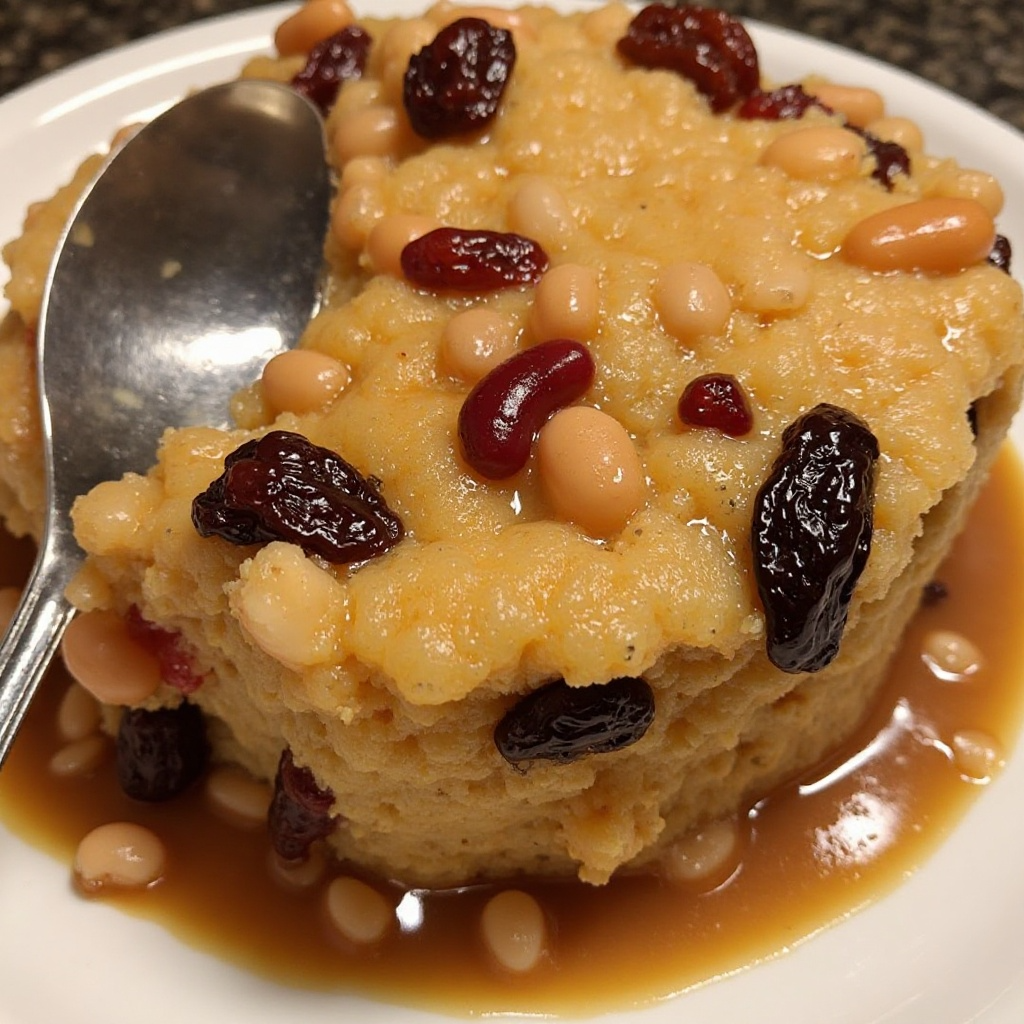 - En una olla grande, mezcla las habichuelas cocidas, las pasas de uva, ciruelas pasas, almendras picadas y azúcar moreno. Cubre con agua y cocina a fuego lento hasta que las habichuelas estén suaves (aproximadamente 30 minutos).
