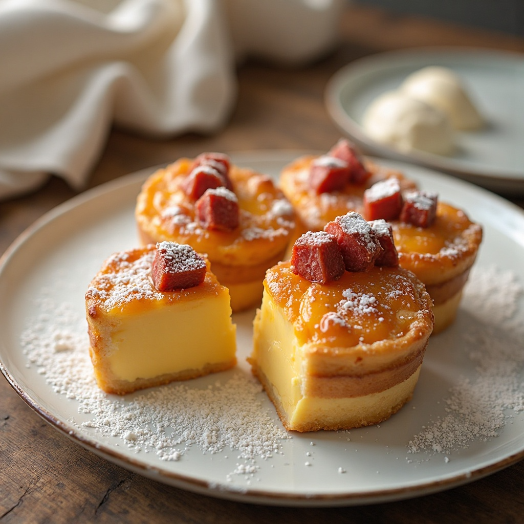 - Saca los pasteles de nata del horno y coloca un cubo de chouriço encima de cada pastel antes de espolvorear con azúcar glass para realzar el sabor y la textura crujiente.