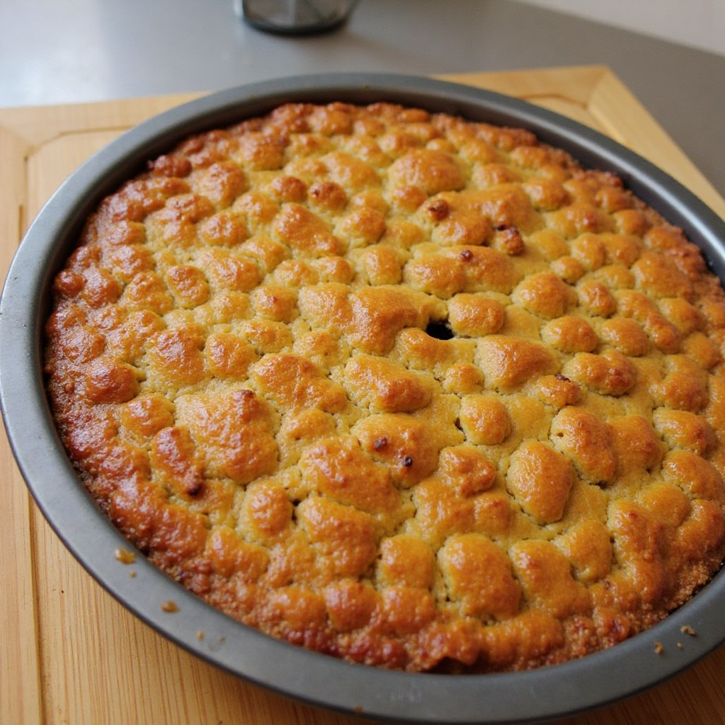 3. Coloca la masa en un molde para tartas previamente engrasado y enharinado. Haz un agujero en el centro para permitir el horneado de forma uniforme.