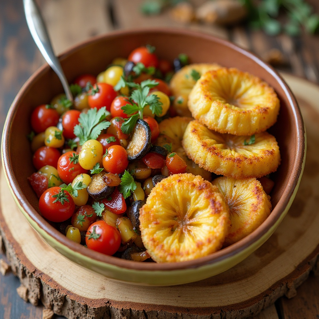 5. Sirve el pisto con el patacón caliente, disfrutando de la textura crujiente del patacón y los sabores suaves del pisto manchego.