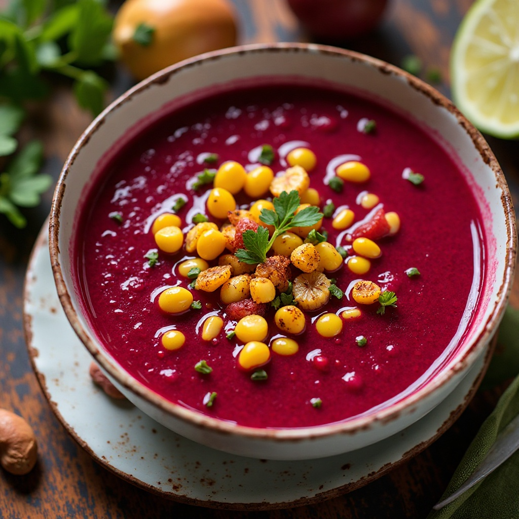 El uso de caldo de verduras y el puré de remolacha hacen que esta receta sea baja en grasas y rica en nutrientes. El maíz es una excelente fuente de fibra, mientras que los especia como el comino y el pimentón aportan beneficios antioxidantes. Si prefieres un sabor más ácido, puedes aumentar la cantidad de limón.