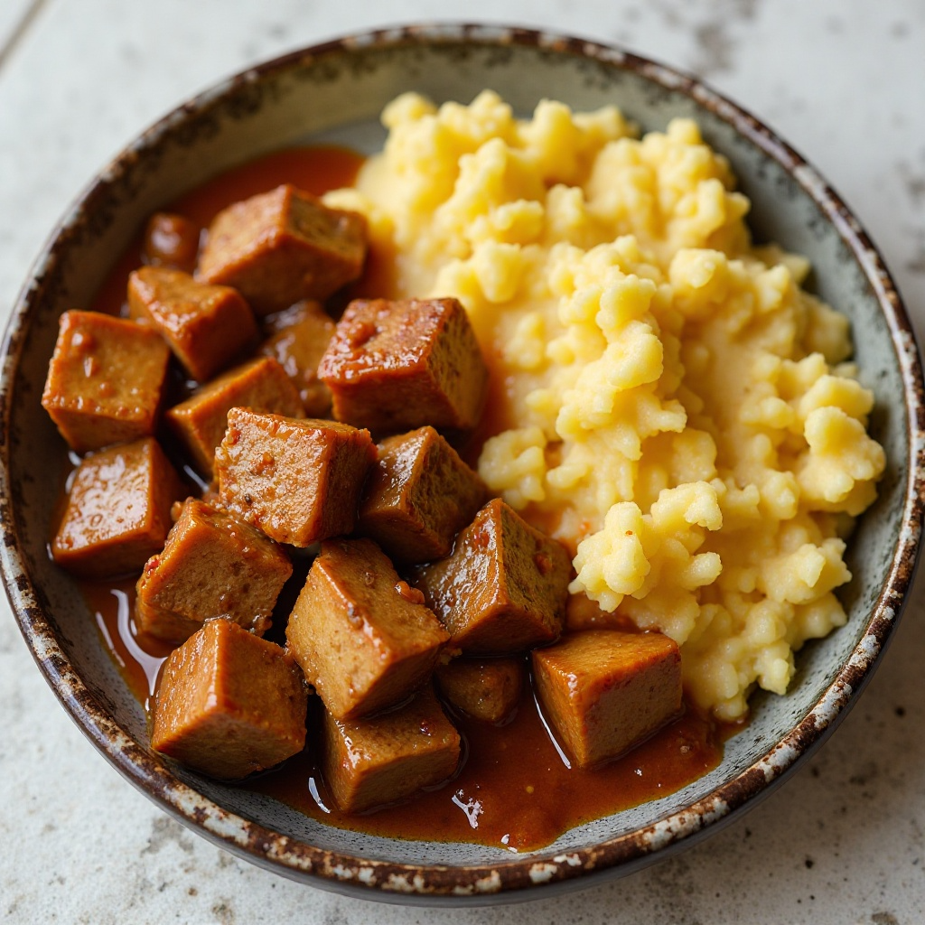 El peka es un plato emblemático de Lesoto, donde se celebra con gran entusiasmo en ocasiones especiales. La inclusión del puré de papas es una adaptación moderna que realza el sabor tradicional con ingredientes internacionales. Lesoto, conocido por su rica diversidad cultural y gastronómica, ofrece platos como este que fusionan influencias indígenas con estilos culinarios más globales, reflejando un rico tapiz cultural.
