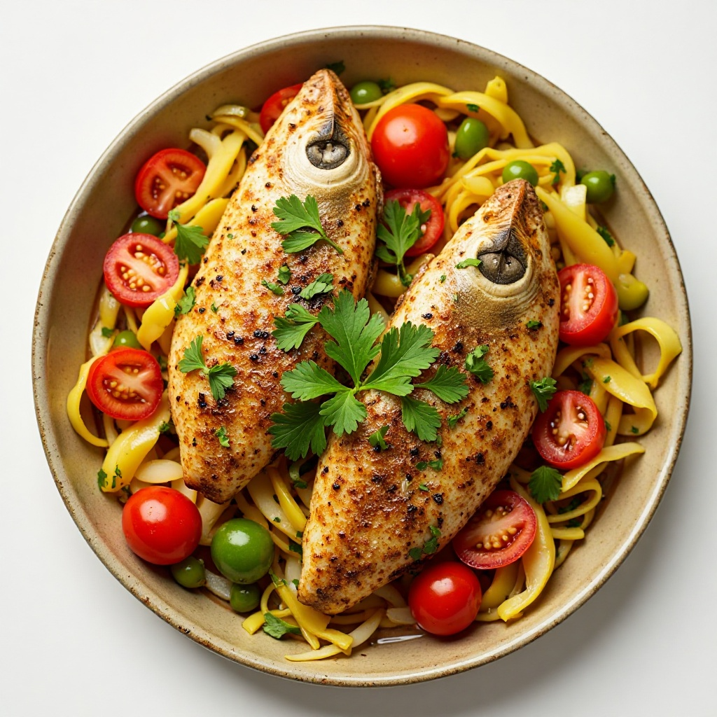 Este plato es una fuente saludable de proteínas y contiene vitaminas C y antioxidantes presentes en los pepinos amargos y tomates. El uso de aceite de oliva en la preparación proporciona beneficios cardiovasculares. Asegúrate de que el pescado esté bien cocido para asegurar su seguridad alimentaria.