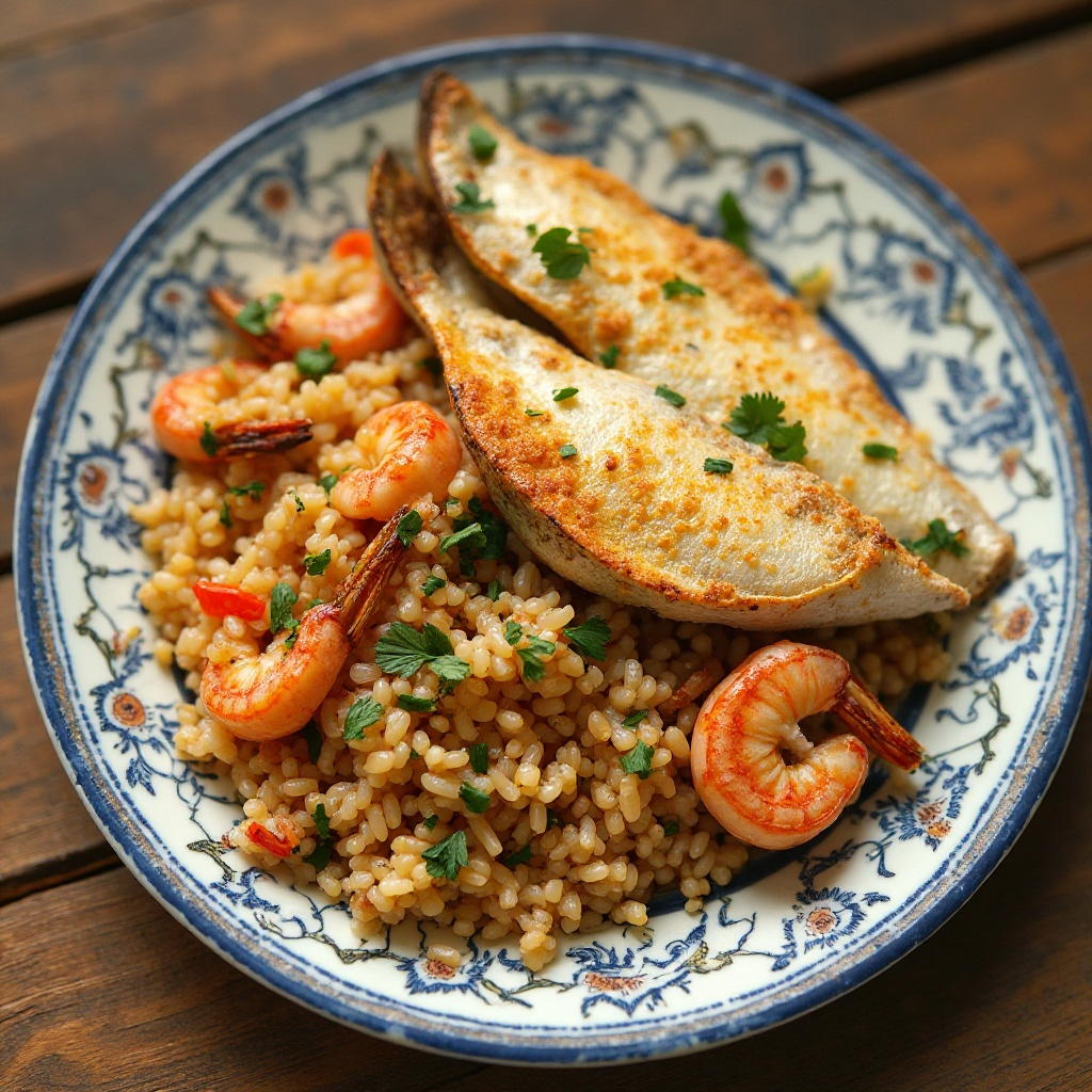 El Pescado a la parrilla es un plato tradicional en muchas culturas costeras, y en Bolama, una isla del archipiélago de Guinea-Bissau, se combina con un arroz de mariscos que refleja la rica biodiversidad marina de la región. Este plato es perfecto para una comida familiar o una reunión informal, ofreciendo un sabor auténtico y lleno de mariscos.