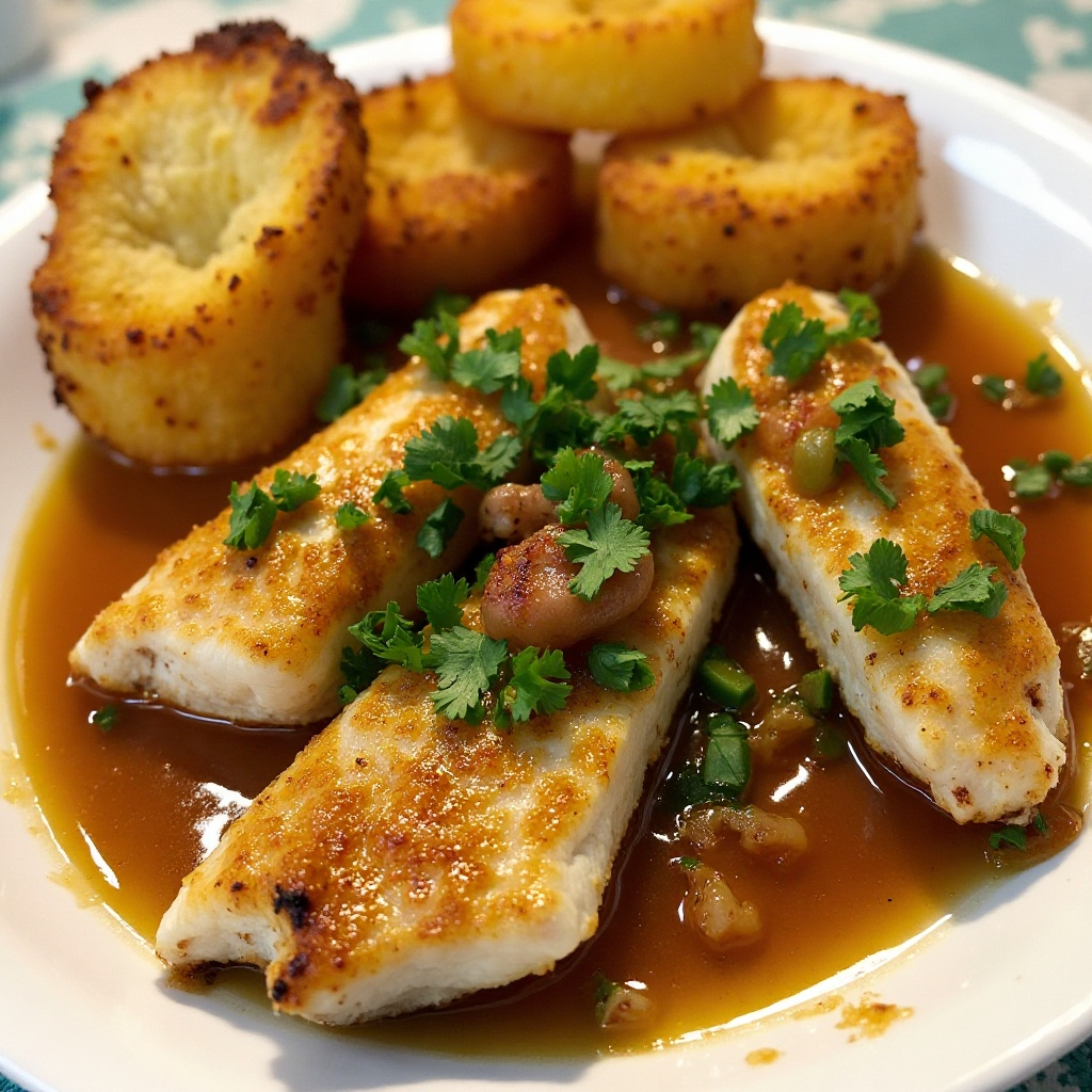 - Sirve los filetes de pescado caliente con una generosa cantidad de Mojo Hartón alrededor. Coloca los tostones a un lado o en la misma bandeja para servir.