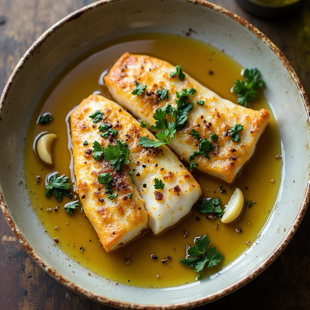 - Una vez cocido el pescado, retíralo de la sartén con cuidado. Si queda líquido en la sartén, deja que reduzca y luego vierte el jugo de pescado sobre la salsa de ajos, revolviendo suavemente para integrar los sabores.