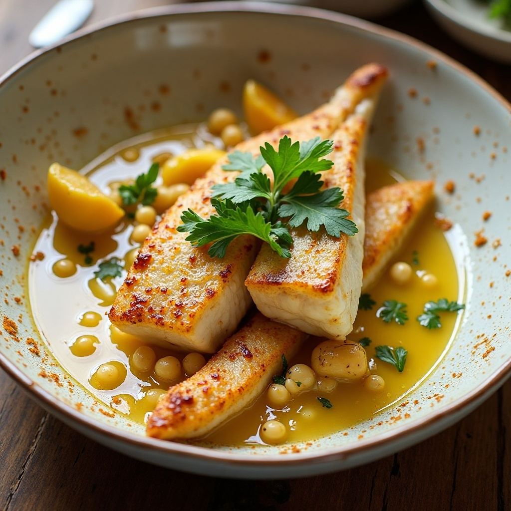 - Cuando el pil-pil esté bien formado y las burbujas de aceite comiencen a reducirse, retira el fuego. La emulsión tendrá un color dorado y una textura espesa. Sirve los filetes de pescado con el pil-pil sobre ellos, decorando con cilantro fresco.