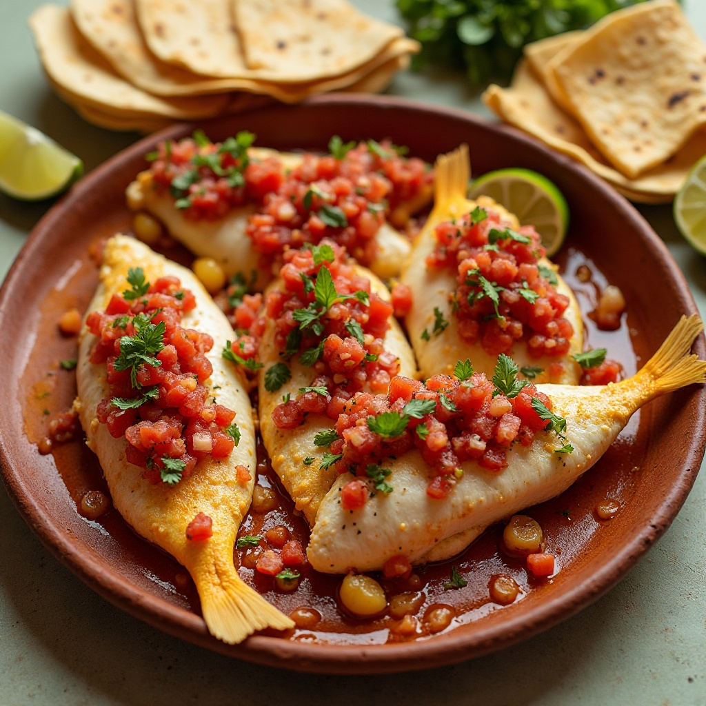 6. Acomoda los filetes sobre la salsa preparada, cubriéndolos completamente. Introduce al horno a 180°C (350°F) durante aproximadamente 15-20 minutos, o hasta que el pescado esté cocido y adquiera un color dorado.