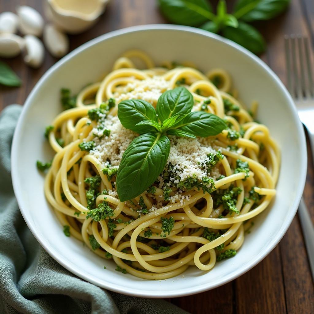 El Pesto alla Genovese es una salsa clásica y vibrante que se origina en la región de Liguria, específicamente en Génova. Esta receta ha sido adaptada para un toque especial en Sestri Levante, manteniendo los sabores auténticos del pesto mientras incorpora espagueti como acompañamiento, perfecto para disfrutar en una comida relajada o en una noche especial.