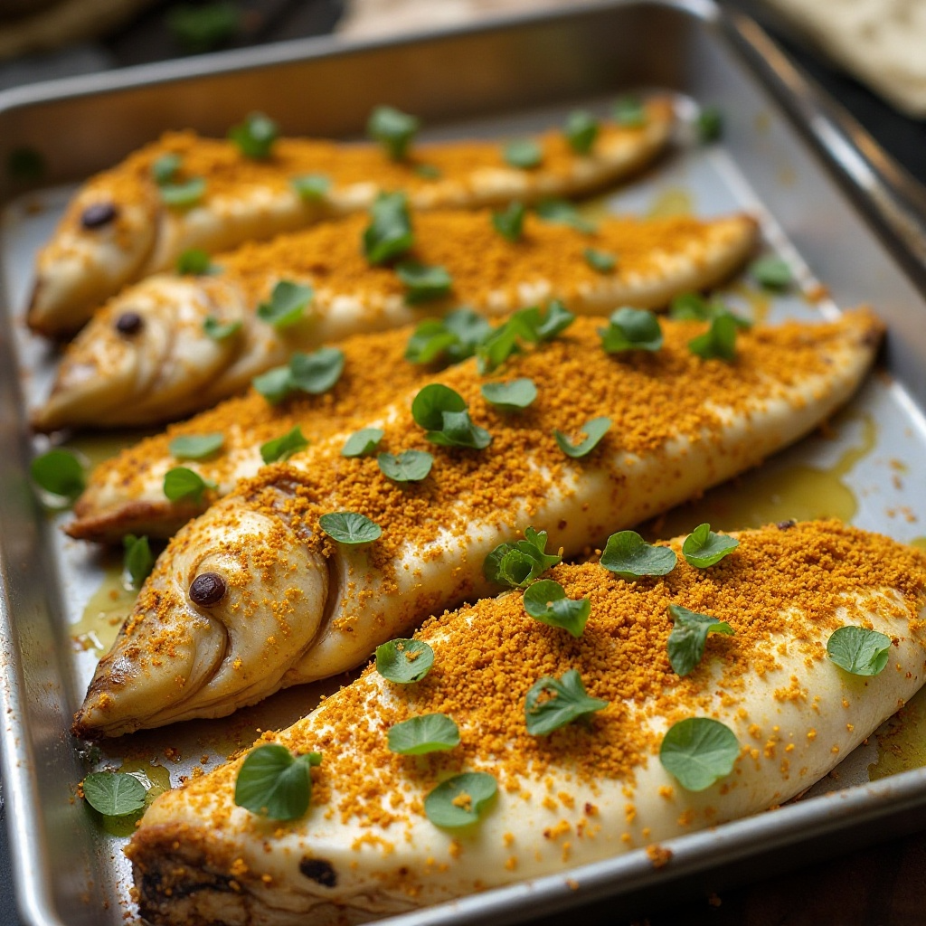 - Coloca el pescado en una bandeja para horno, espolvorea generosamente las especias sobre cada porción de pescado y revuelve para asegurar que todas las piezas estén cubiertas.