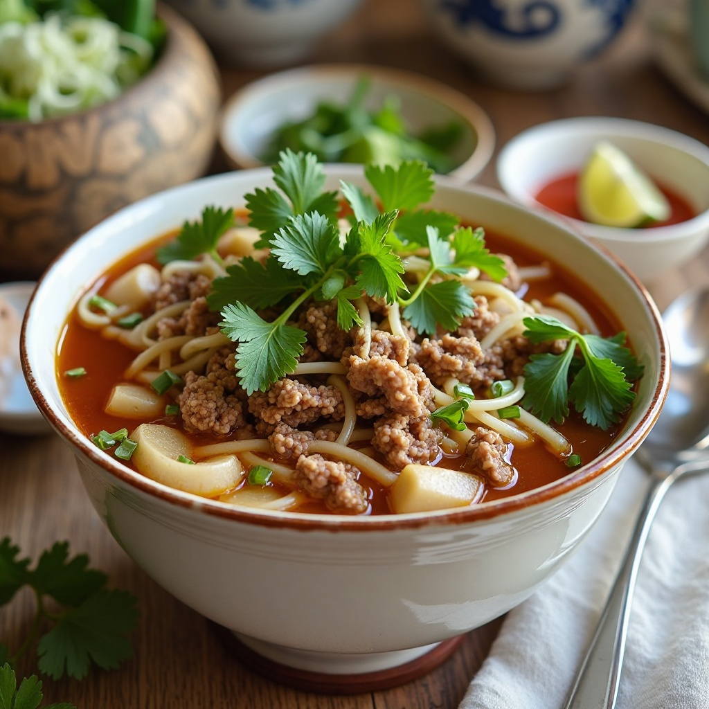 5. Sirve el caldo caliente en tazones profundos, colócate la carne y cubre con los fideos. Añade las hojas de lechuga china y cilantro fresco.
