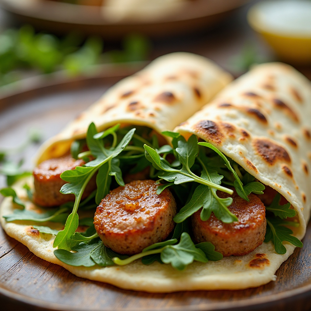 5. Coloca la rucola en el lado sin sal y pimienta de la piadina. Añade la salsiccia a los bordes de la rucola, asegurándote de que las salsiccia se cubra bien con la verdura.