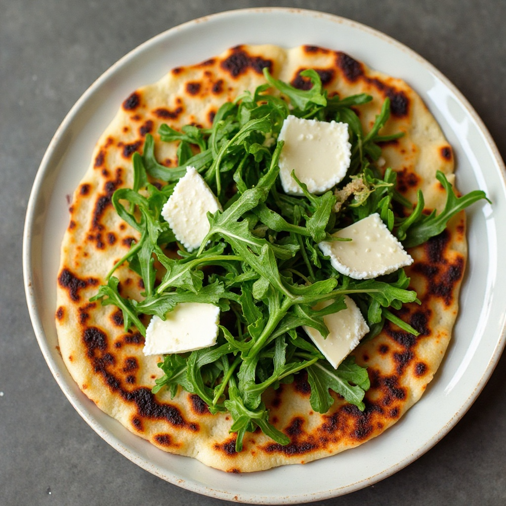 4. Una vez que la piadina esté lista, retírala suavemente de la sartén y colócala en un plato. Cubre generosamente con rúcula fresca y coloca el queso de cabra sobre ella.
