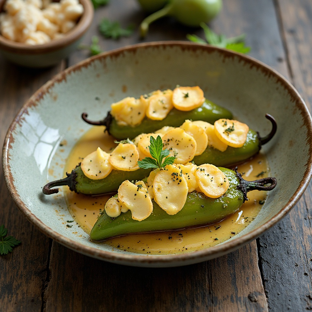 Este plato es una deliciosa adaptación del clásico pimientos de Padrón, utilizando el queso Idiazabal, típico de la región de Güeñes en España. El Idiazabal aporta un sabor ahumado y picante, que eleva la experiencia gastronómica de los pimientos verdes pequeños.