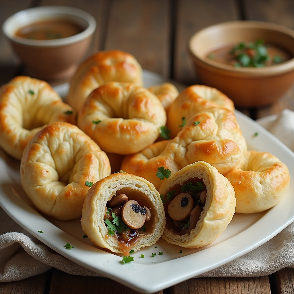 - Rellena las bolas de masa con la mezcla de champiñones y salsa vodka. Cierra cada bola formando un pirozhki, asegurándote de sellar bien los bordes para que no se abran durante la cocción.
