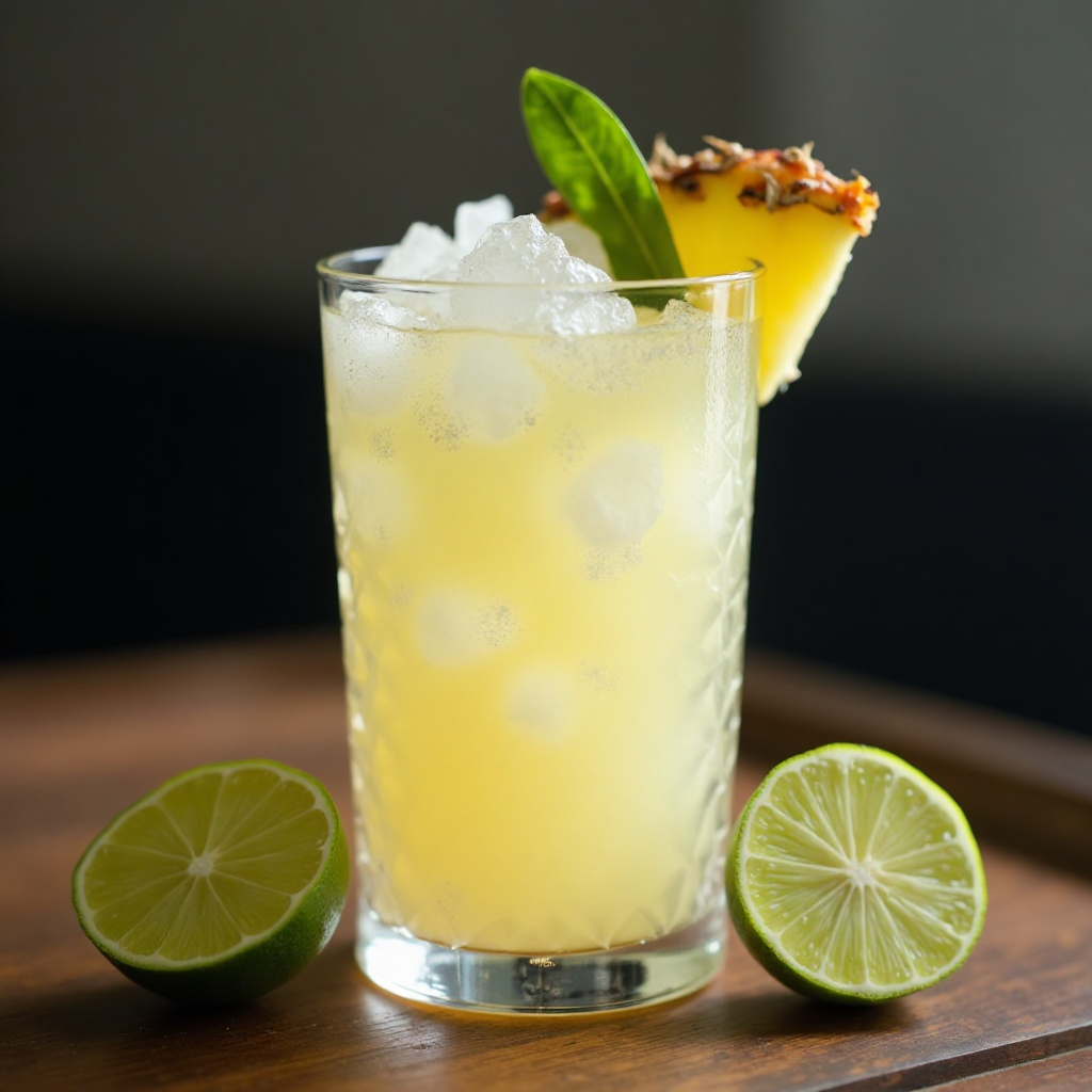 6. Garní con una rodaja de lima y un pequeño trozo de piña, añadiendo un toque visual y aromático al cóctel.