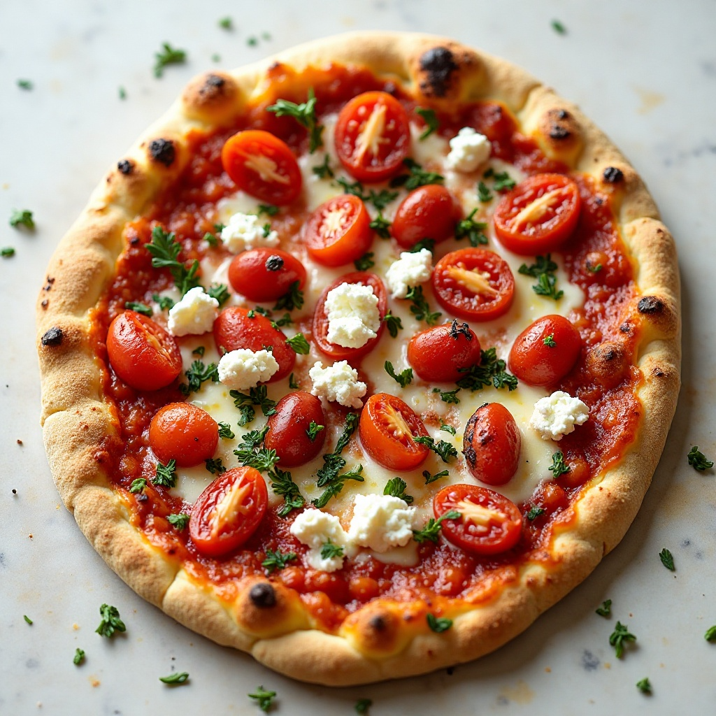 - Coloca una de las pizzas en la sartén y cubre con la mezcla de tomate y cebolla. Espolvorea el queso fresco y distribuye el orégano y el romero. Cocina hasta que la pizza esté dorada y el queso esté derretido.