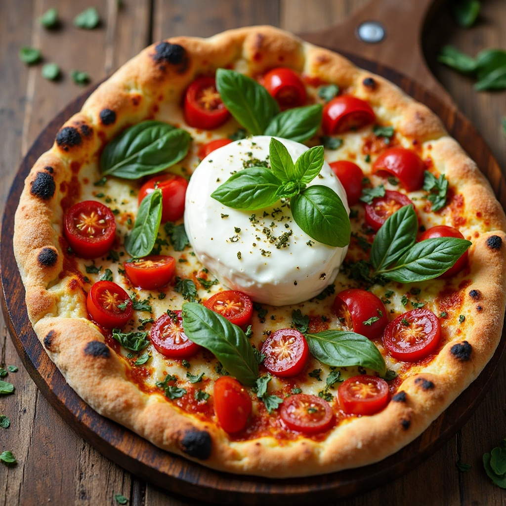 Esta pizza equilibra la rica textura cremosa de la burrata con los sabores frescos y ligeros del pesto genovese y los tomates cherry. La elección de ingredientes naturales y frescos proporciona una opción saludable, rica en antioxidantes y vitamina C. Asegúrate de cocinar la pizza de manera que la burrata se mantenga lo más fresca posible.