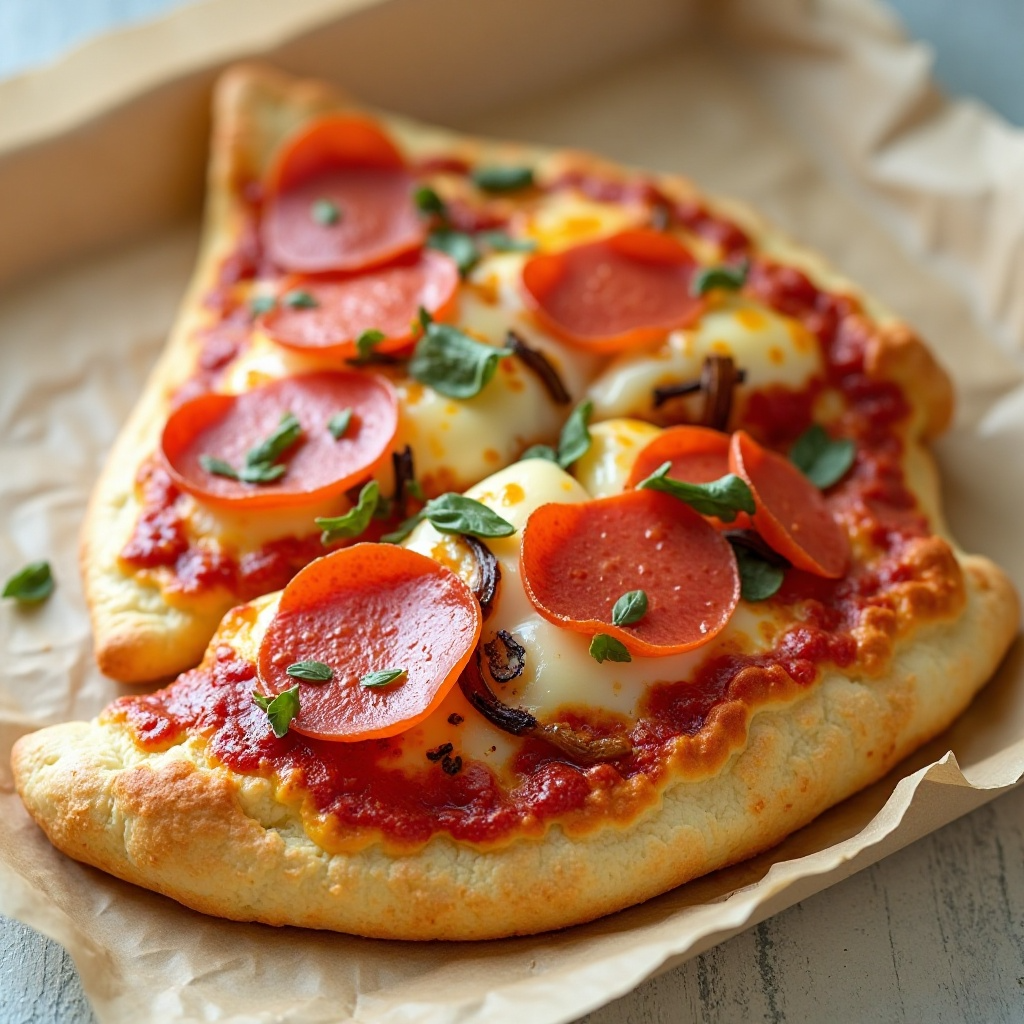 La pizza de calzones es rica en carbohidratos y grasas saludables presentes en el queso. Para una versión más balanceada, considera reducir la cantidad de pepperoni o añadir más verduras como espinacas o champiñones.