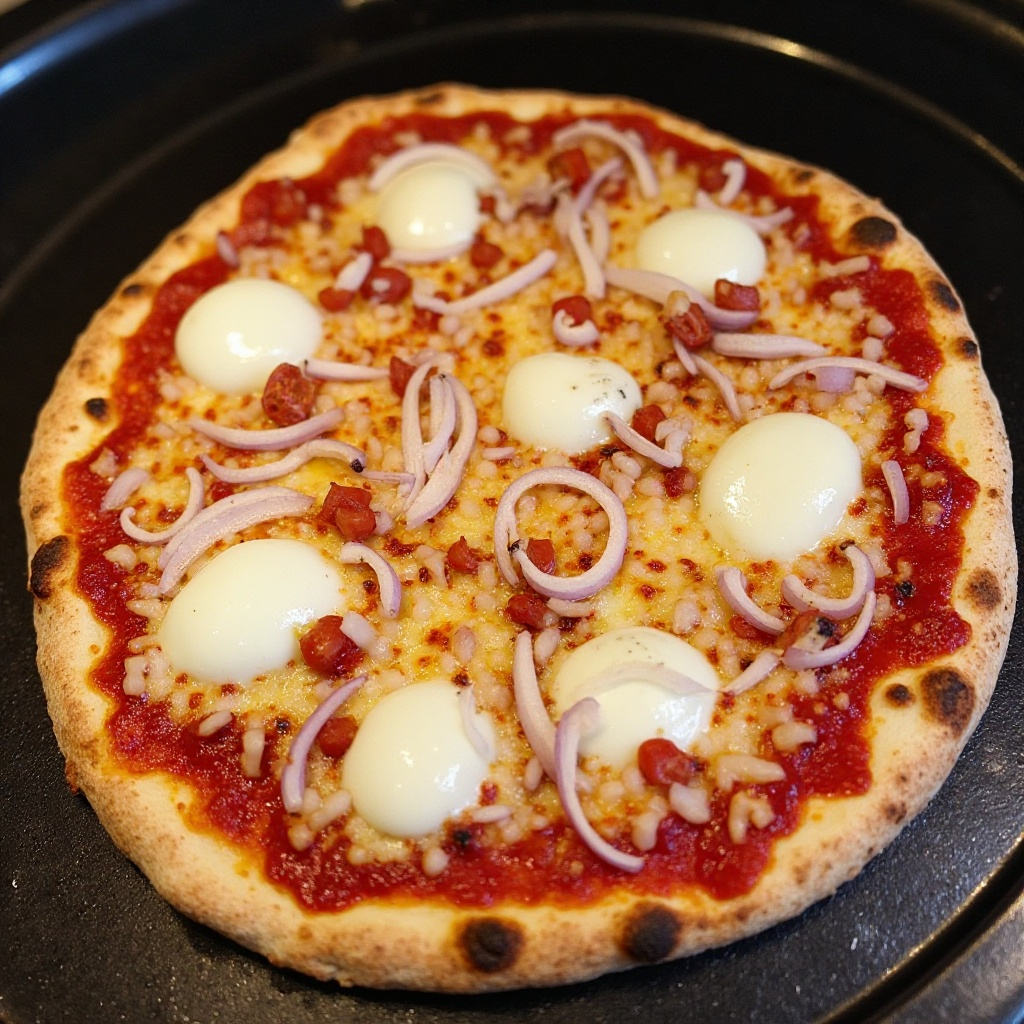 - En una sartén, bate el huevo con un poco de agua fría y aceite de oliva, mezclando bien. Vierte esto suavemente sobre la pizza para crear una salsa ligera de huevo.