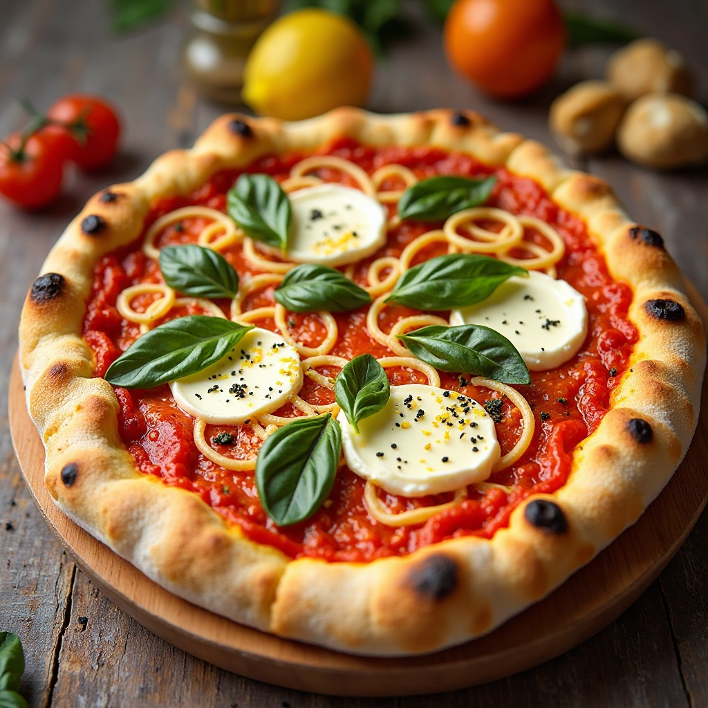 La pizza Margherita es un clásico italiano que simboliza la esencia misma del sabor italiano. En Bari, una región costera del sur de Italia, se le da un toque único incorporando taralli, un tipo de anillo salado típico de la región de Apulia, que ofrece una textura crujiente y un sabor salado que complementa perfectamente a la pizza.